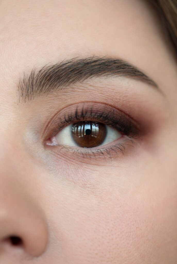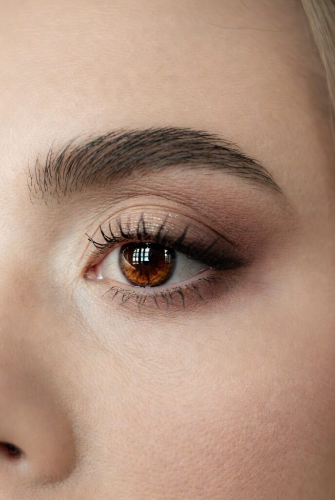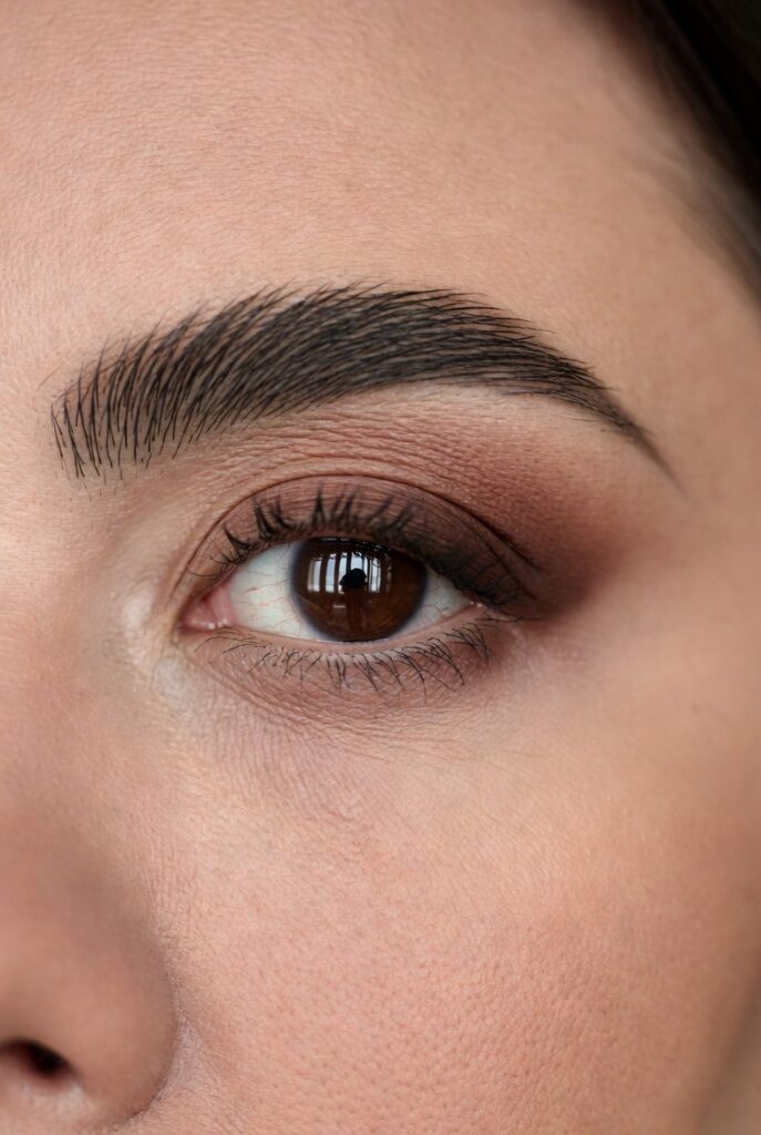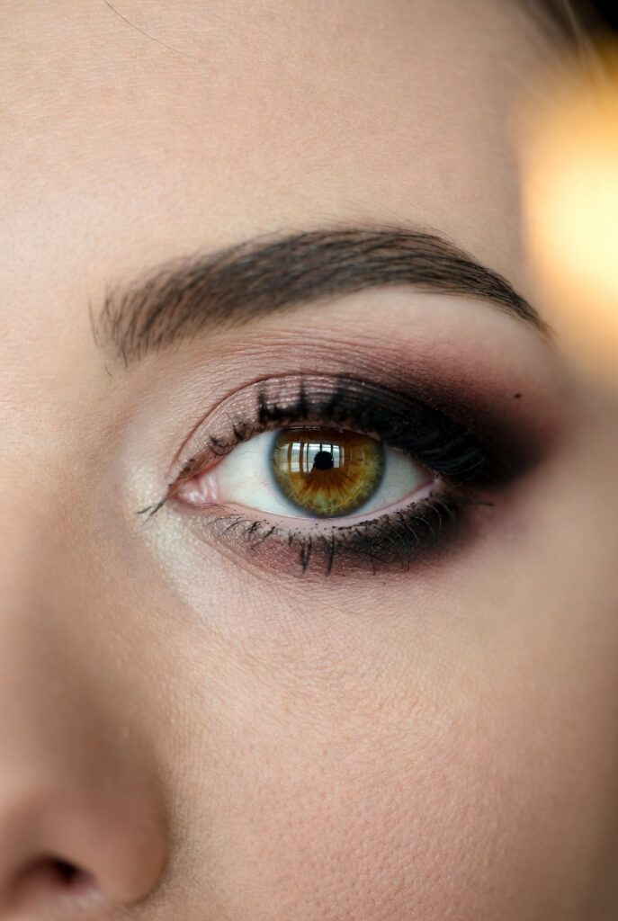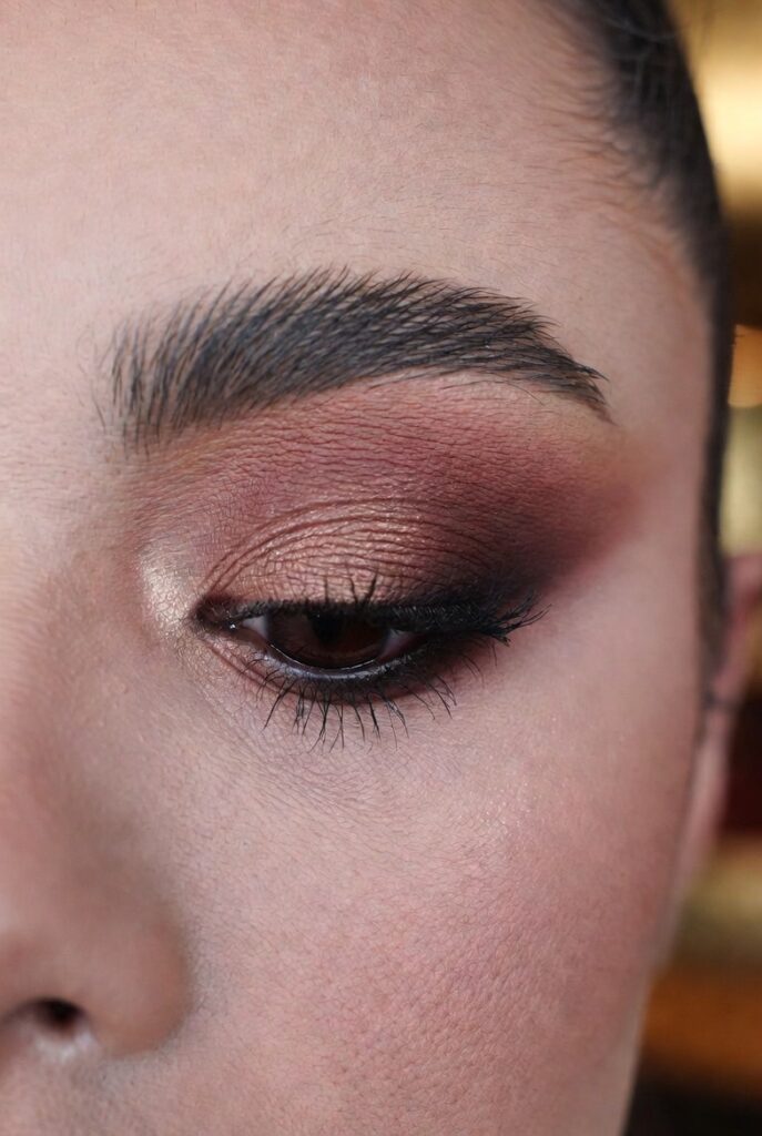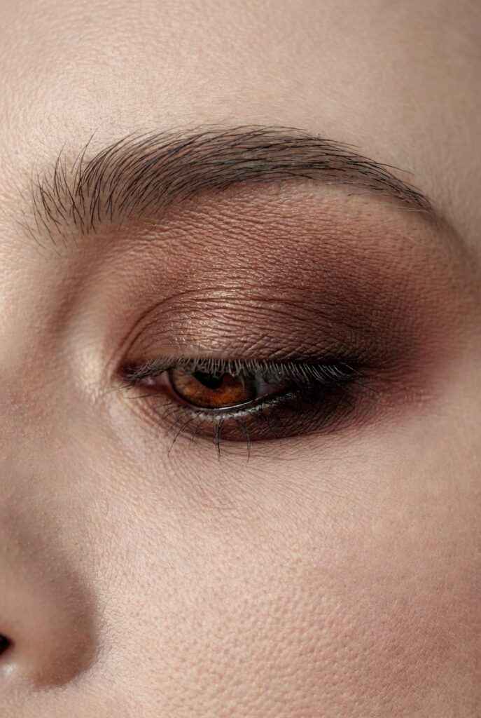 This look uses warm, matte brown eyeshadows to create a soft, wide-eyed effect. By applying a lighter shade in the center of the eyelid and deeper shades on the inner and outer thirds, the blended halo technique makes eyes appear rounder and larger. It’s a perfect look for daytime or a subtle, natural glam moment.