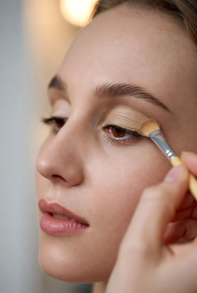 Now, let’s put color on the lid. Take your flat shader brush and pick a light neutral shade—something close to your skin tone or slightly lighter.