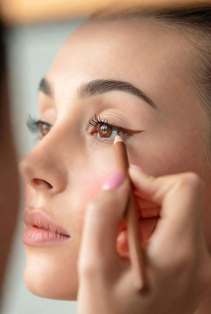 Eyeliner is often the step where beginners panic, but it doesn’t have to be perfect. Grab your pencil liner in brown or black.