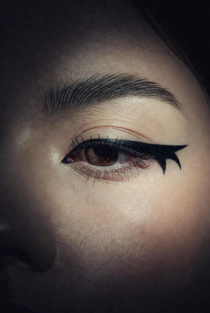You could draw floating bat wings in your crease, creating a silhouette that is only visible when your eyes are open. Another option is to draw “stitches” across your eyelid or brow bone, giving the illusion of skin that has been sewn together. You need a steady hand and a high-quality liquid liner for this. If you make a mistake, don’t panic—just use a Q-tip dipped in micellar water to clean up the edges. The beauty of graphic liner is that it looks intentional and high-fashion.