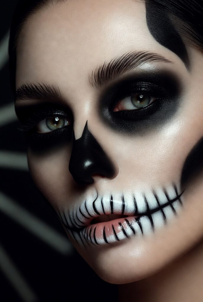 Skull makeup is a Halloween classic, but doing a full face of bones can be time-consuming and difficult to get symmetrical. Instead, focus the skeletal details around the eyes. This creates a mask-like effect that is both creepy and cool.