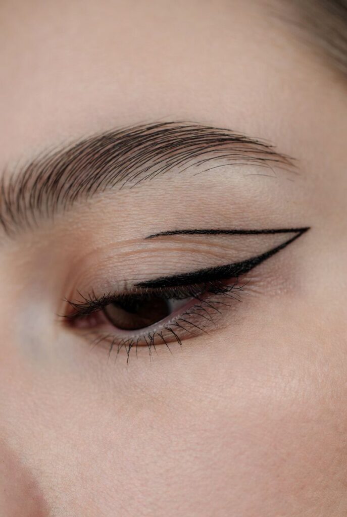 A sharp, black liquid liner adds a feline lift to the eye. For a bold night-out look, don’t be afraid to extend the wing further than you would for daytime wear.