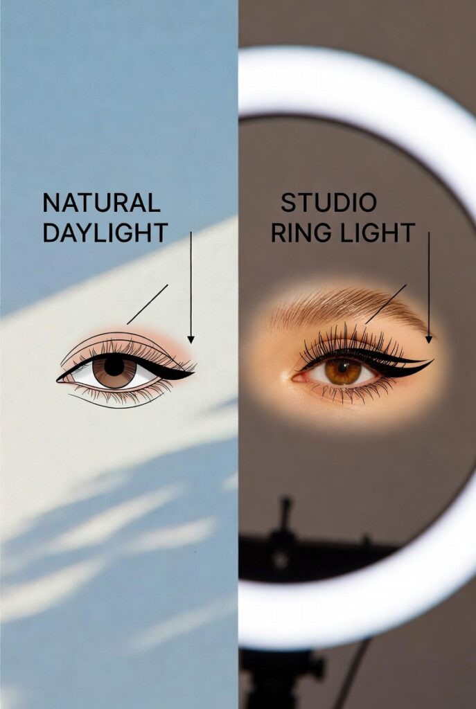 Natural Light: This is the most unforgiving light. It reveals texture, unblended edges, and color mismatches. If you are filming in front of a window, ensure your blending is seamless. Avoid heavy powders, as sunlight will highlight “cakey” texture.