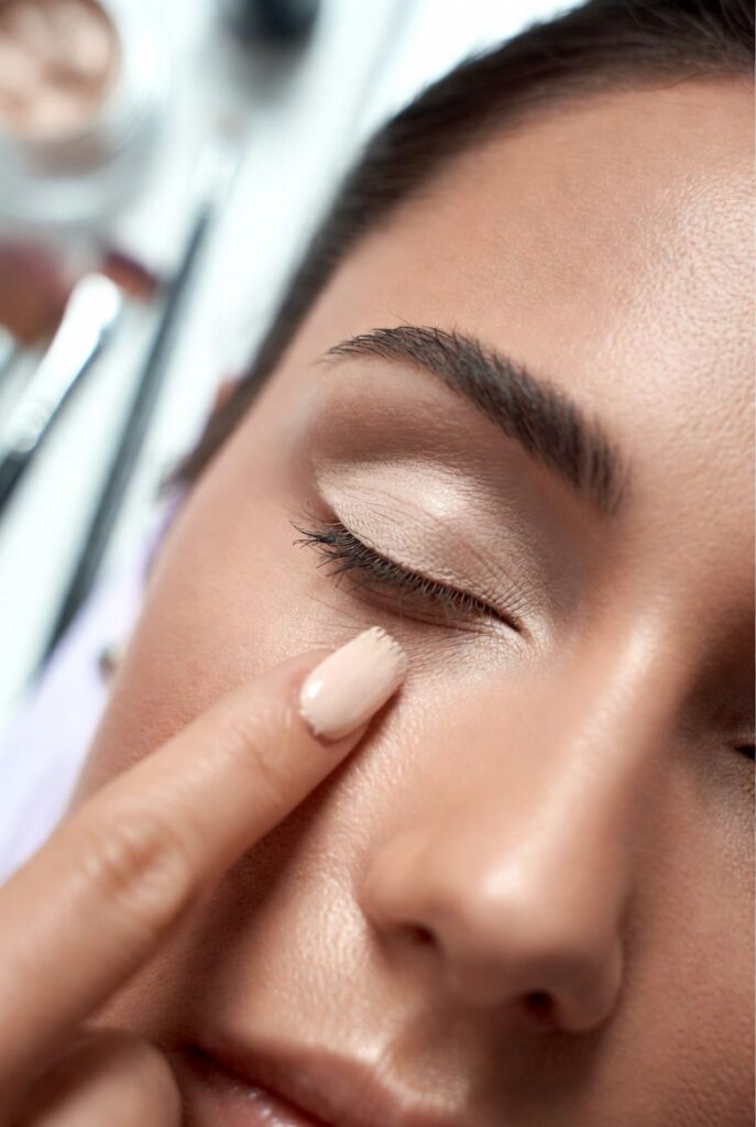 Heat from lights or nervousness can cause makeup to migrate. To prevent “raccoon eyes,” use waterproof eyeliner and mascara. Additionally, set your under-eye concealer with a finely milled loose powder to stop your mascara from transferring onto your skin.